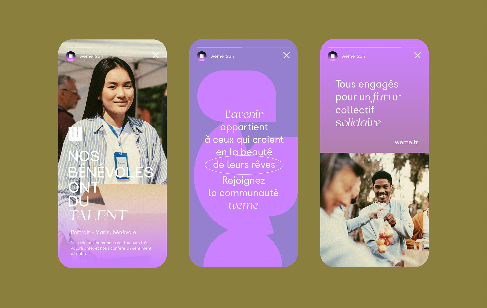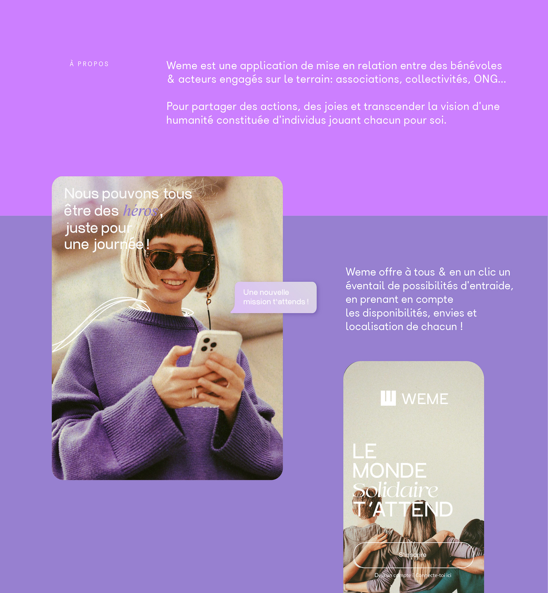 Weme is a networking application connecting volunteers with dedicated organizations in the field, such as associations, local authorities or NGOs. It enables users to share actions, moments of joy and transcend the idea of a humanity made up of individuals each acting on their own.